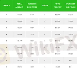 您可以看到,2%的风险和10%的风险之间存在巨大差异。您每次交易拿10%的账户资金冒险,如果交易连败,连续19次交易失败,您2万的起始资金还剩下3002,您将损失账户总额的85%!