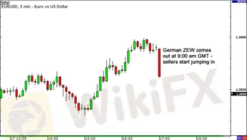 让我们看一下图表,看交易商如何利用这些诀窍来发挥他们的优势。下面是欧元/美元的5分钟图表。在这里我们看到,刚刚发布的德国ZEW经济景气指数,这是一个影响力很大的数据报告。散户交易者正在看他们的图表,看到欧元/美元正在下跌,所以他们决定出手了。