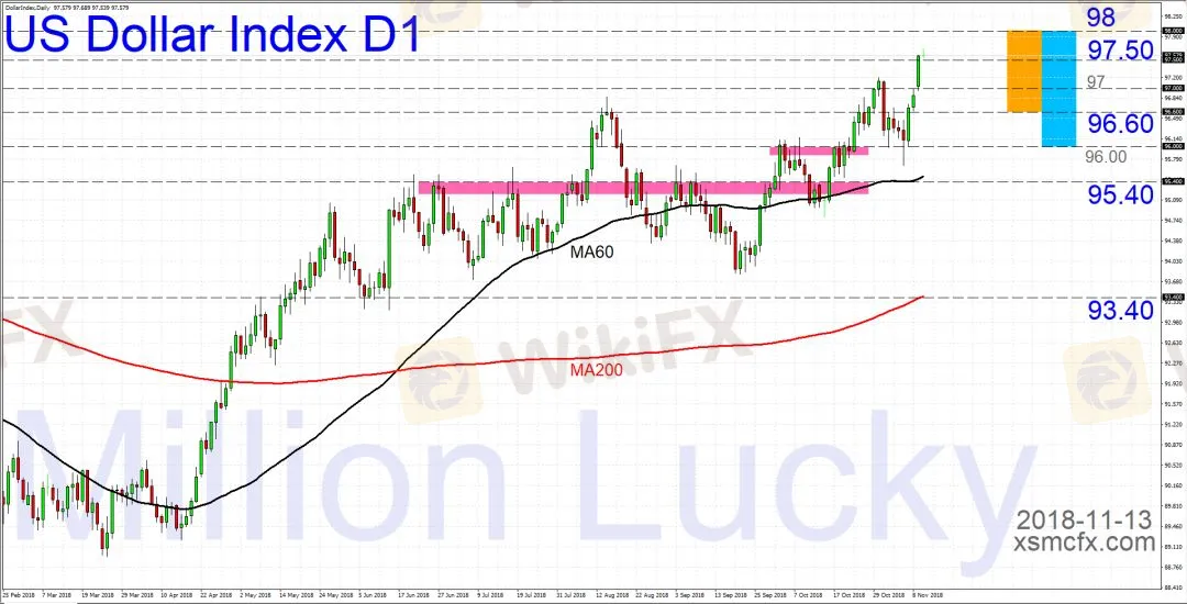 (下图) 美元指数 昨日持续创高,今日可能区间97-98。