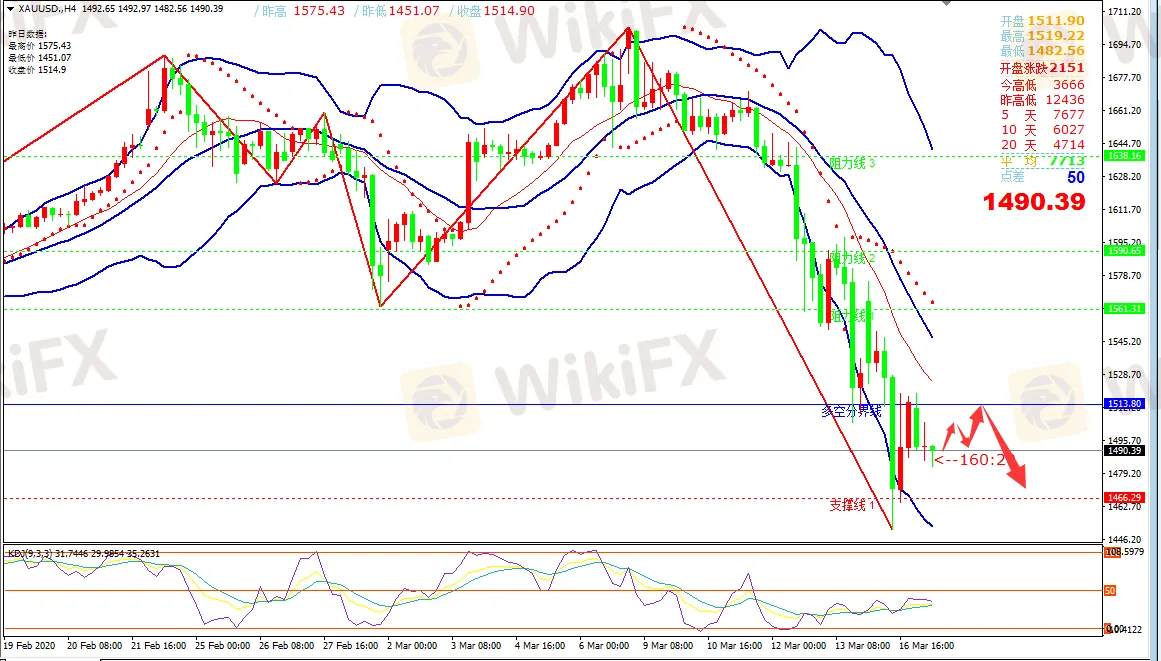 摘要:2020年3月17日 星期二周一开盘跳高,最高拉升1575.43美元/盎司,美盘继续大跌,最低1451.07美元/盎司,日线破纪录幅度跌破124美元,之后回调拉升,周二最高在1520美元/盎司附近遇到上方阻力,最低148