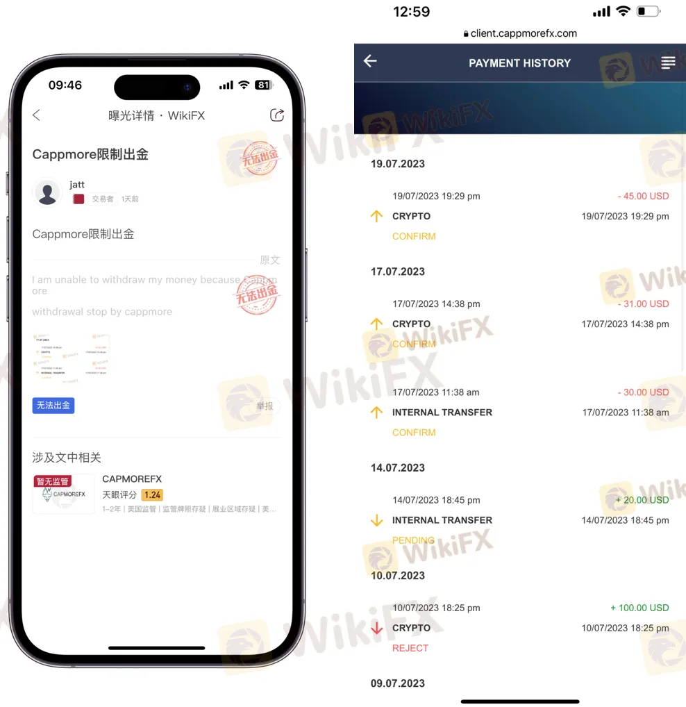 日前,一位卡塔尔的投资者向WikiFX投诉“CAPMOREFX”平台已经停止提款,无法出金,并附上自己的账户截图。