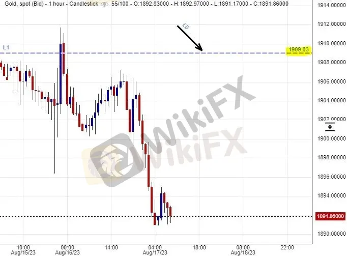 可以部署在$1,909美元左右建立淡仓盘,短线看淡金价一线至$1,881美元水平后止赚,止损在$1,917美元。
