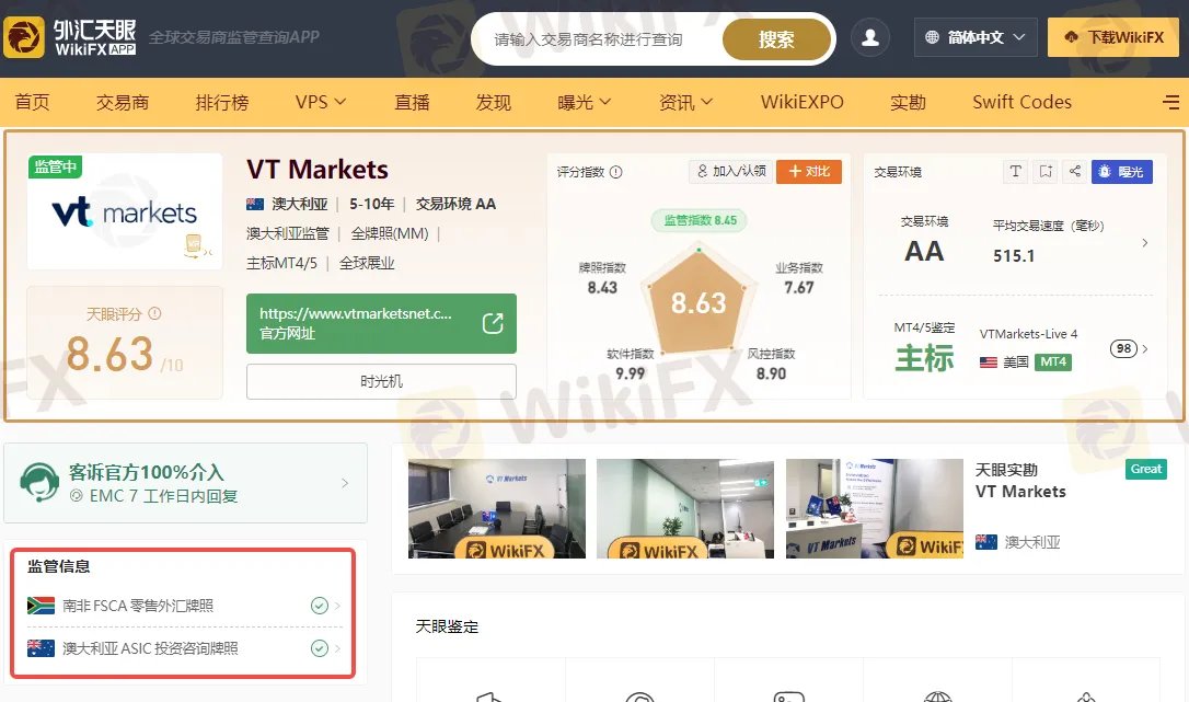 通过外汇天眼查询可知,VT Markets目前受到澳大利亚证券和投资委员会(ASIC)和南非金融部门行为监管局(FSCA)的监管,持有澳大利亚证券和投资委员会(ASIC)投资咨询牌照和南非金融部门行为监管局(FSCA)零售外汇牌照。