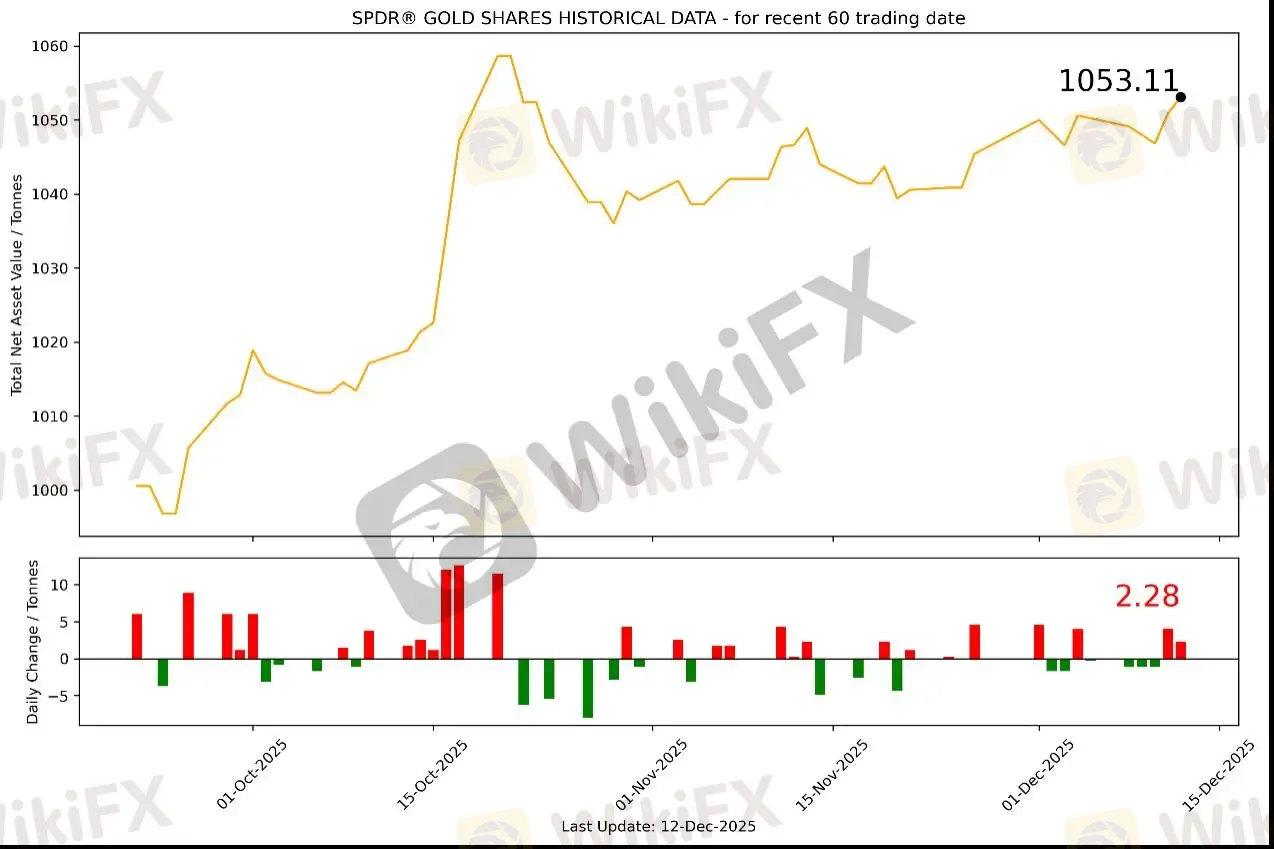 截至12月12日,全球最大的黄金ETF SPDR Gold Trust持仓量为1053.11吨,较上一个交易日增加2.28吨。12月12日现货黄金开盘后短暂下跌至4263美元附近,随后重拾涨势,美盘盘前一举突破4350美元/盎司,最高向上触及4353.57美元/盎司,创近七周新高,但随后急跌近百美元,最终收于4299.285美元/盎司,涨20.135美元或0.47%。
