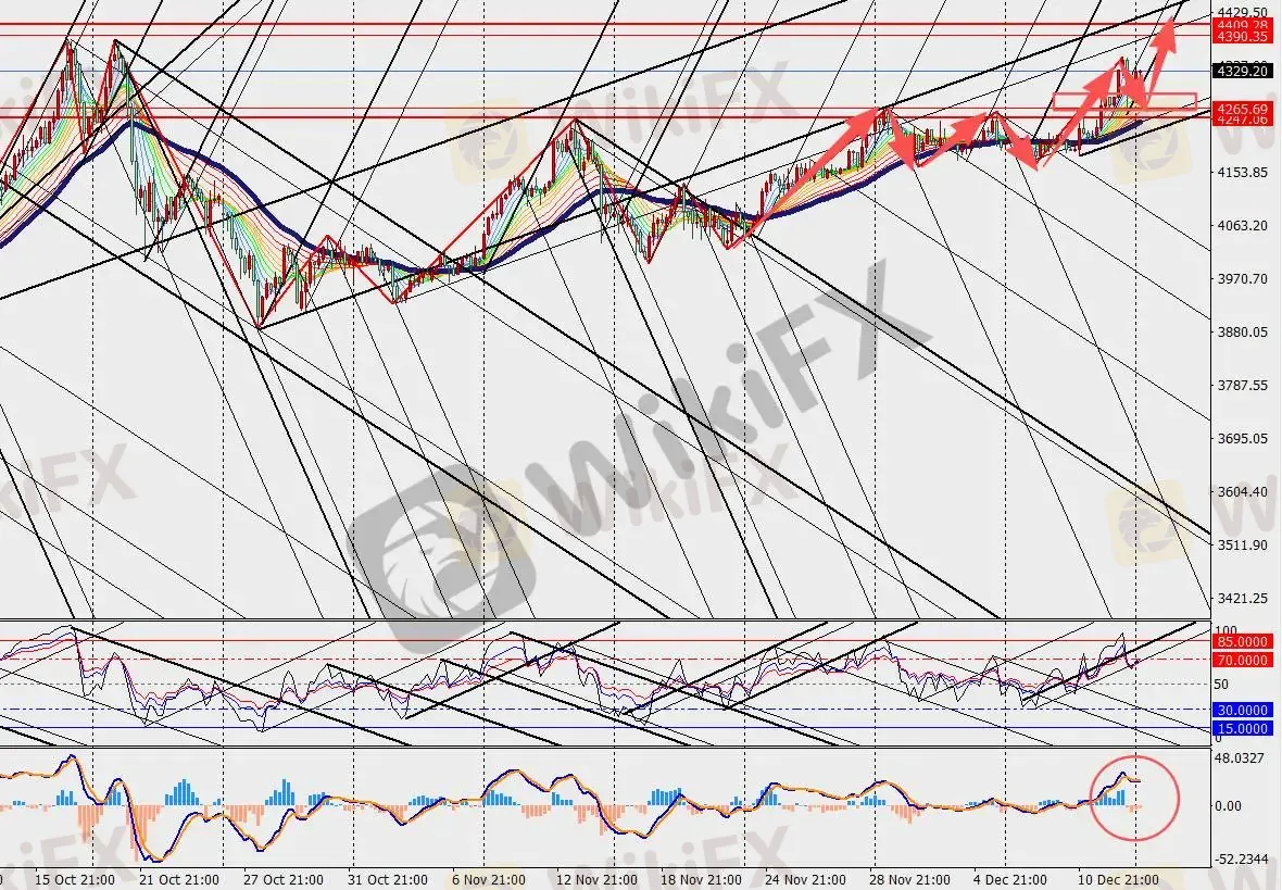 黄金H4级别震荡上升,MACD双线和量能柱在零轴上方收敛。降息预期和避险需求为金价提供坚实底部支撑,但在关键数据与政策表态明朗之前,金价更可能通过高位震荡而非单边上行来完成调整。