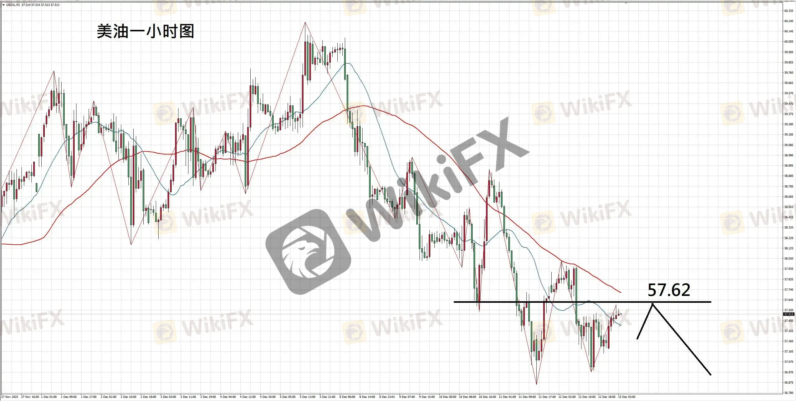 美油一小时图,走势相对高低点下降,均线向下弯曲,显示卖压较强;如后续反弹受阻,则走势或继续向下,故建议短空操作。