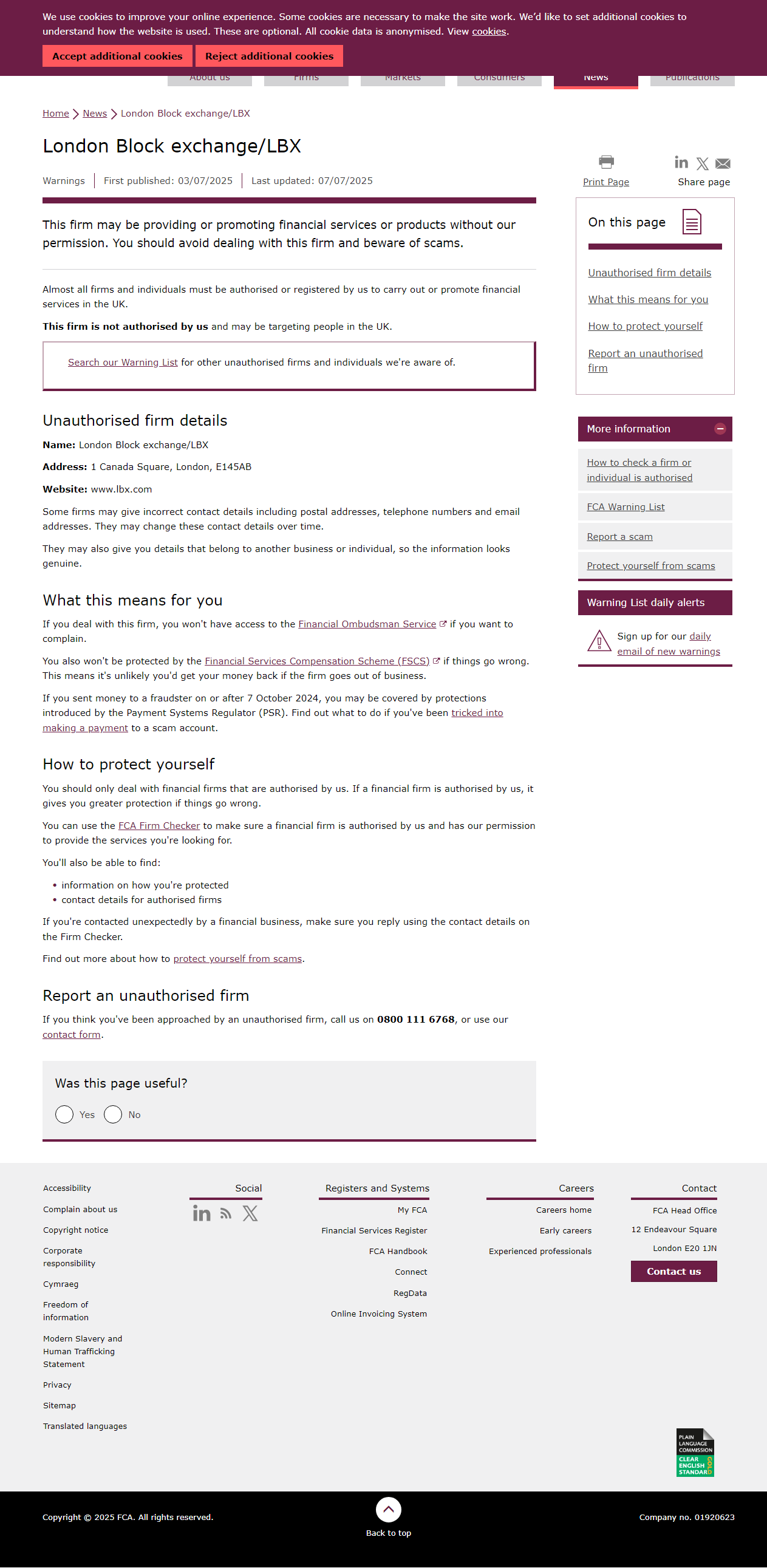 该公司可能在未经我们许可的情况下提供或推广金融服务或产品。您应避免与该机构交易,并谨防诈骗。几乎所有在英国开展或推广金融服务的机构和个人都必须获得我们的授权或注册。该公司未经我们授权,可能针对英国民众。请在我们的警告列表中搜索其他 我们已知的未经授权公司及个人。未经授权公司详情名称:London Block exchange/LBX地址:1 Canada Square, London, E145AB网站:www.lbx.com部分公司可能提供错误的联系方式,包括邮政地址、电话号码及电子邮箱。这些联系方式可能随时间变更。它们还可能提供属于其他企业的详细信息或 个人,因此 这些信息看起来是真实的。.