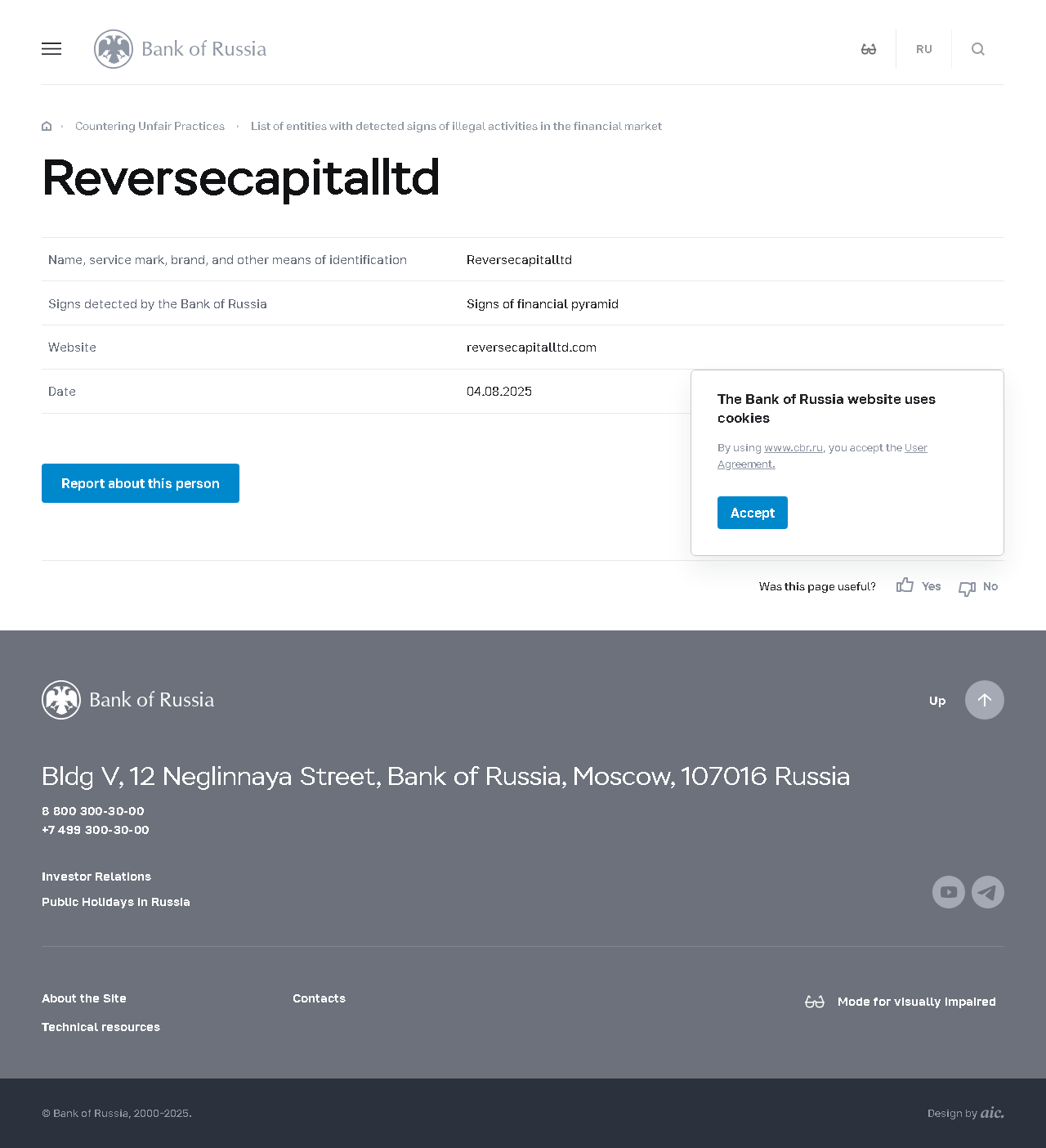 金融市场中检测到非法活动迹象的实体名单 Reversecapitalltd.