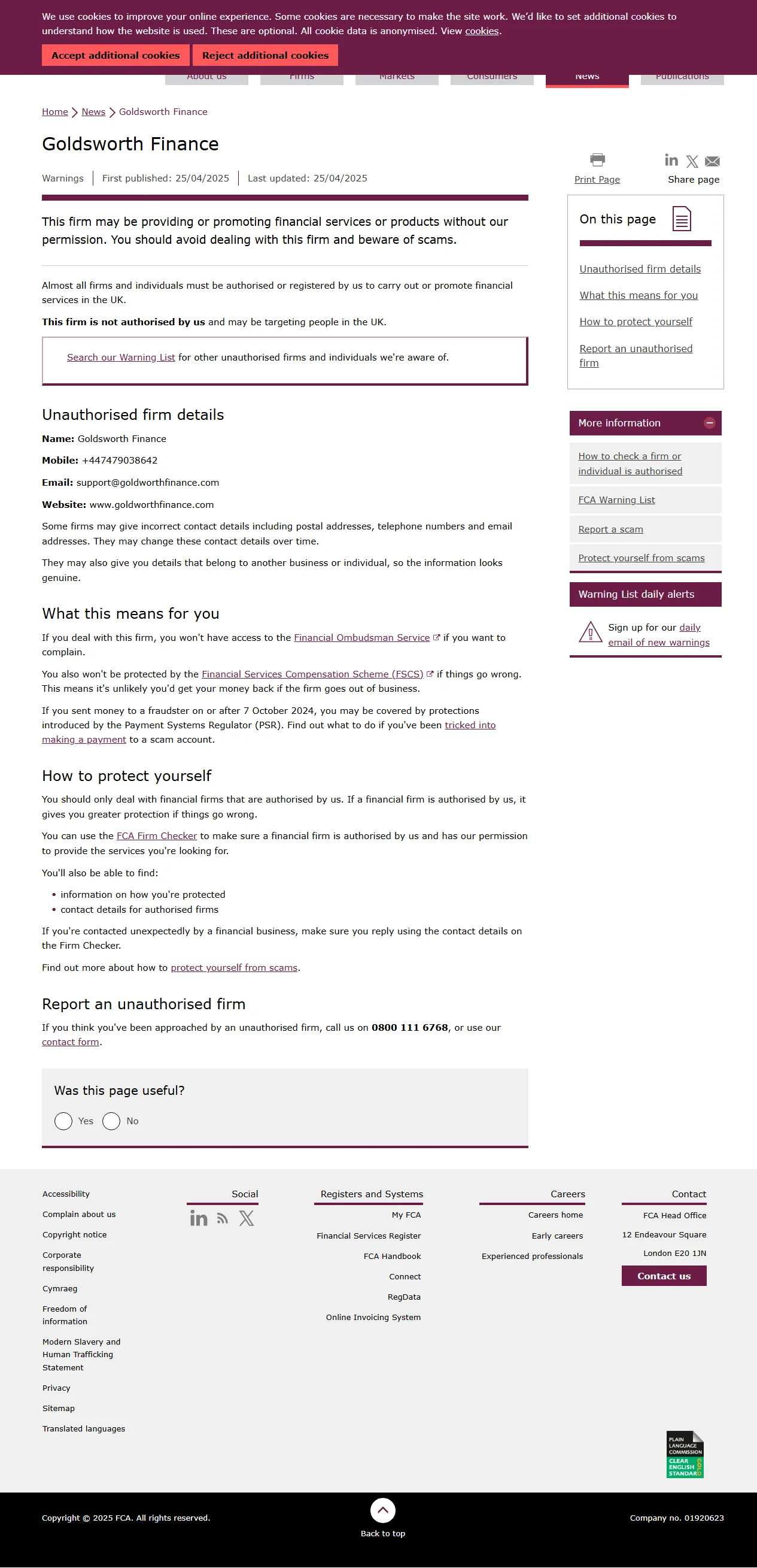 FCA未经授权公司警告名单Goldsworth Finance.