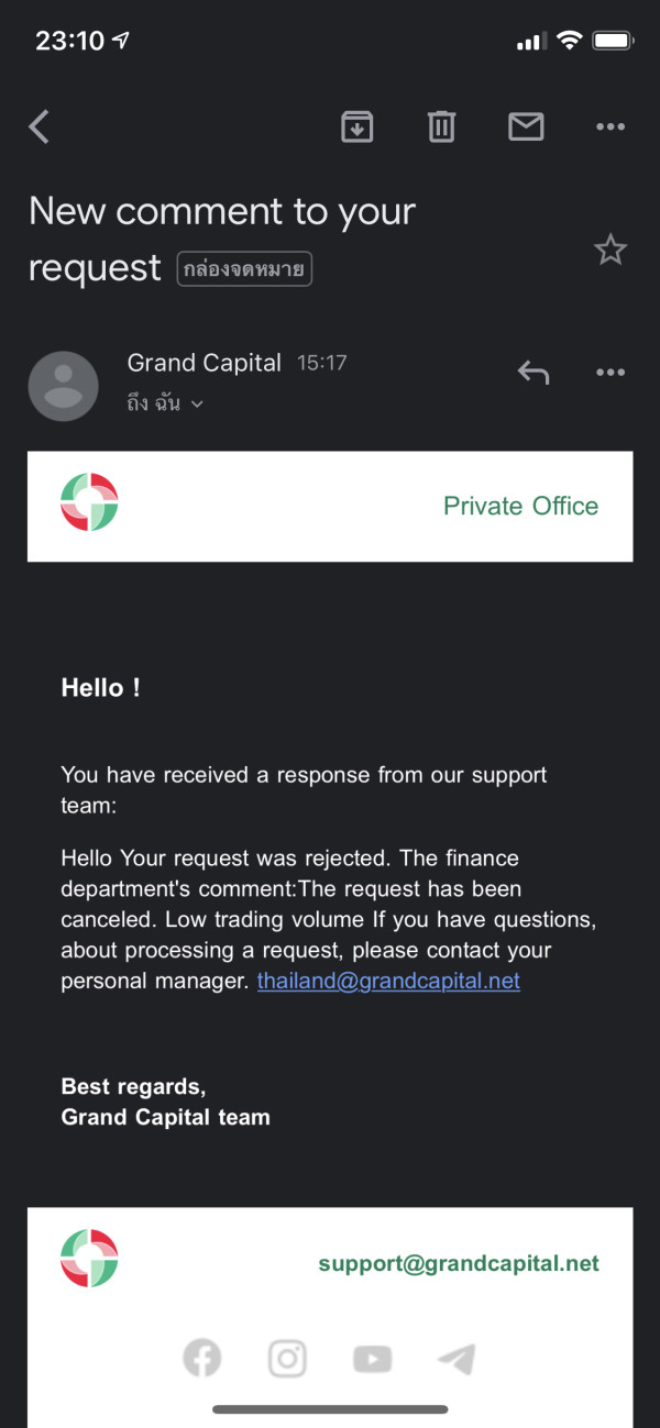 ฉันได้ทำการถอนเงินจากนั้นทางโบรคติดต่อฉันมาว่าฉันทำผิดกฎซึ่งคนที่นำโปรโมชั่นมาเสนอแก้ฉันคือIBและแอดมินGrandcapitalBKKและบอกเงื่อนไขฉันมาเพียงแค่6ข้อพร้อมกับข้อความว่าถ้าฝาก1000$ขึ้นไปไม่ต้องทำLotและไม่ได้บอกกฏอะไรฉันนอกเหนือไปมากกว่านี้เลย ซึ่งฉันก็ทำตามทุกอย่างแต่พอมาวันนี้ได้ทำการถอนเงินแต่ถูกทางโบรคปฏิเสธ I made a withdrawal then the broker contacted me that I broke the rules which the person who brought the promotion to me was IB and GrandcapitalBKK admin and told me only 6 conditions with the message that If you deposit 1000 $ or more, you don't have to make a lot and don't tell me any rules other than this. which I followed everything, but today I made a withdrawal but was rejected by the broker