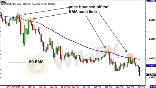 下圖是英鎊兌美元15分鐘線圖,圖中均線為50 EMA,讓我們看看移動均線作為動態支撐和阻力時的情形。