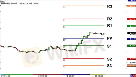 這是在1小時EUR / USD圖表上繪製的樞軸點示例: