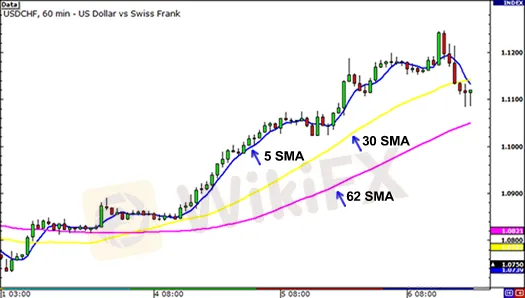 可以看到,相比5個時段和30個時段的簡單移動平均線,62個時段的簡單移動平均線距離當前價格更加遠。