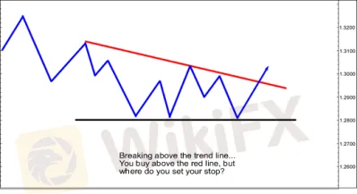 在這個例子中,把止損設定在趨勢線下的支撐區域是最合理的。