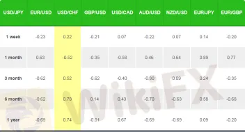 例如,一週期間,美元/日元和美元/瑞郎之間的相關係數是0.22,這是個相當低的相關係數,表明這兩組貨幣對間的相關性不大。