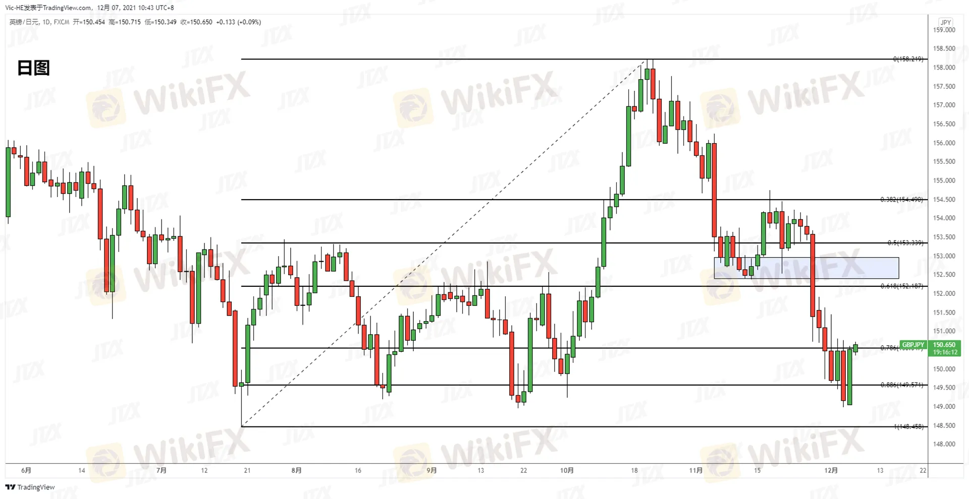 GBPJPY日線到位前期148.5-149區域後出現吞沒形態,短期關注行情反彈力度。上方阻力于152.5上方破位元區域,到位不過可繼續做空。
