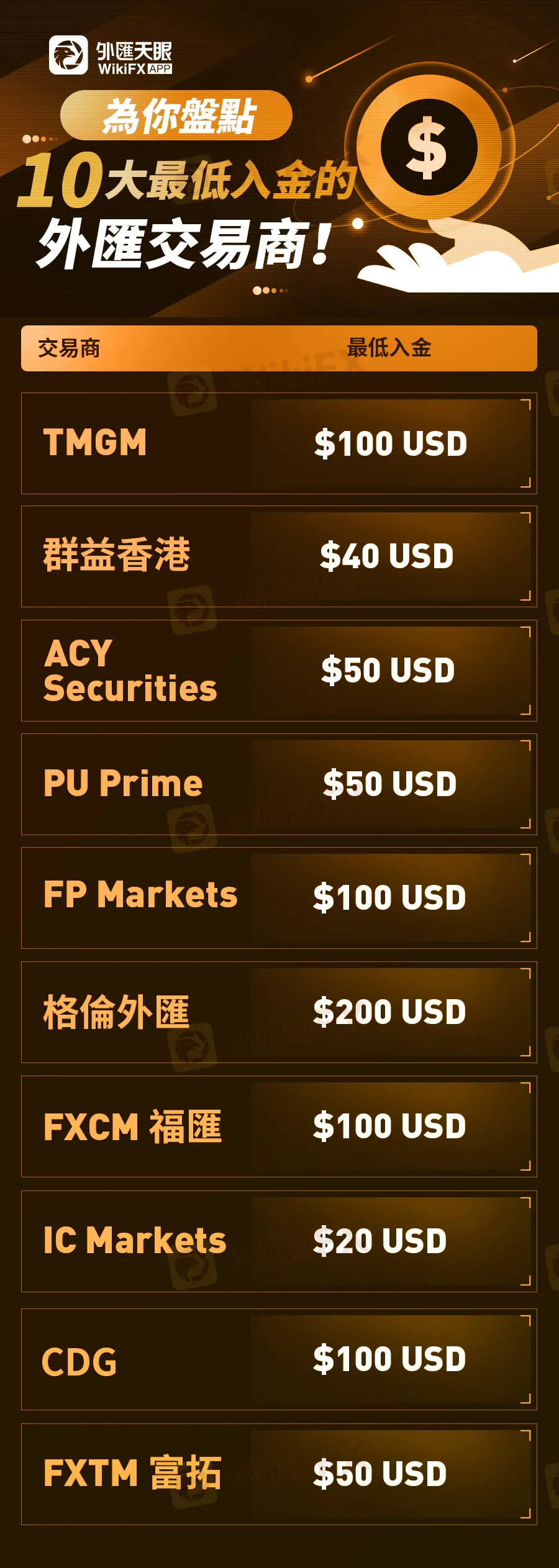 請注意,該列表並無前後排名關係,僅表示列出10家盤點出來的最低入金交易商。