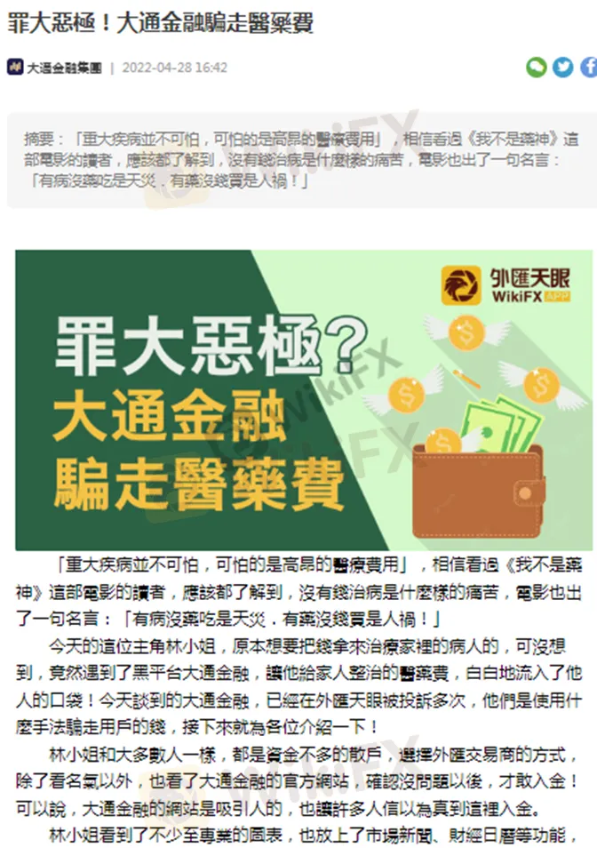 今年4月,外匯天眼曾發布曝光文「罪大惡極!大通金融騙走醫藥費」,揭露大通金融集團詐騙投資人的套路,不但侵吞所有投入帳戶的資金,甚至連10幾萬元緊急醫藥費都不願歸還,簡直喪盡天良!