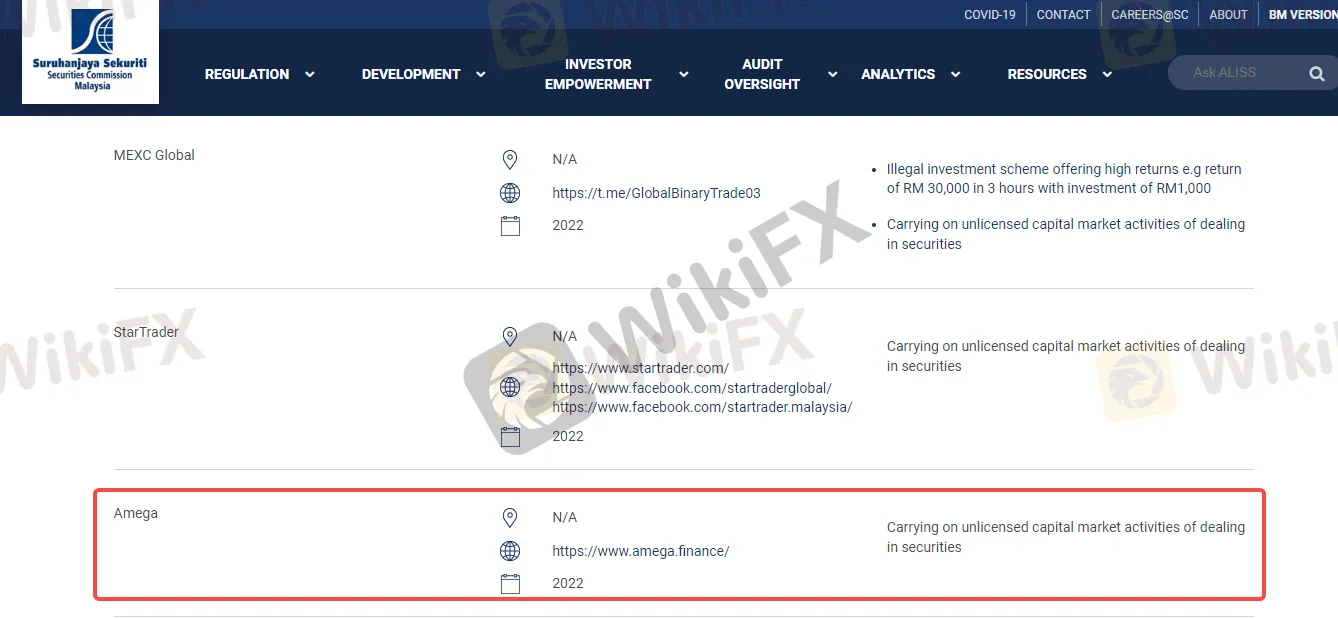 日前,馬來西亞證券委員會(SC)將Amega列入警告名單,因其無牌從事證券交易的資本市場活動。