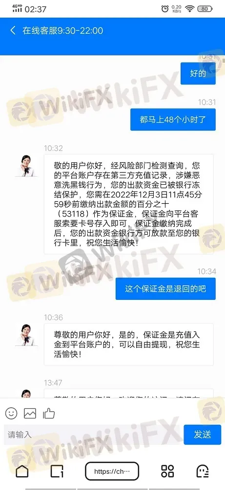 「敬的使用者你好,經風險部門檢測查詢,您的平臺賬戶存在第三方充值記錄,涉嫌惡意洗黑錢行為,您的出款資金已被銀行凍結保護,您需在2022年12月3日11點45分59秒前繳納出款金額的百分之十(53118)作為保證金,保證金向平臺客服索要卡號存入即可,保證金繳納完成後,您的出款資金銀行方可放款至您的銀行卡里,祝您生活愉快!。」