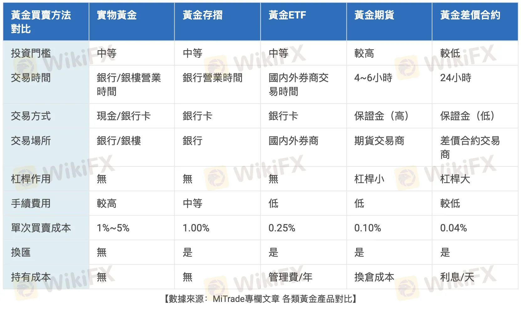 台股黃金ETF的交易成本是管理費(1.15%/年)+手續費(0.15%)+交易稅(0.1%), 美股黃金ETF (GLD)的交易成本是管理費(0.4%/年)+手續費(0~0.1%)+換匯(0.32%), 美股黃金ETF(IAU)的交易成本是管理費(0.25%/年)+手續費(0~0.1%)+換匯(0.32%)。 |
