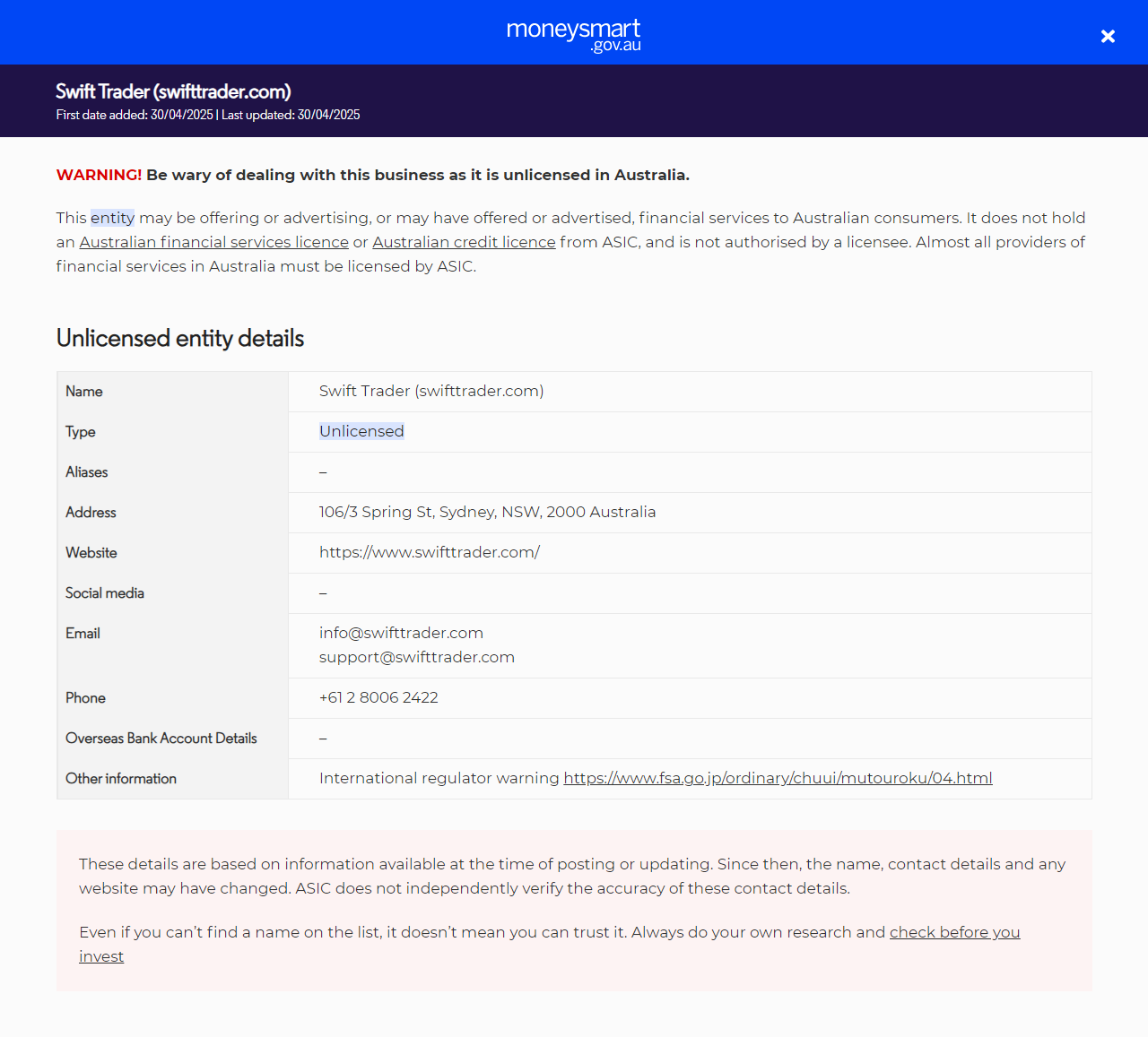 向澳大利亞民眾提供金融服務(包括金融產品)但未持有許可證。他們未持有澳大利亞證券投資委員會(ASIC)頒發的澳大利亞金融服務(AFS)許可證或澳大利亞信貸許可證。